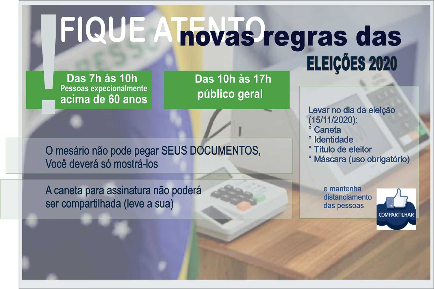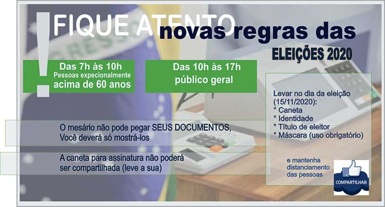 - Horário de votação - o período de votação foi ampliado. Será das 7h às 17h, com horário preferencial de 7h às 10h para maiores de 60 anos