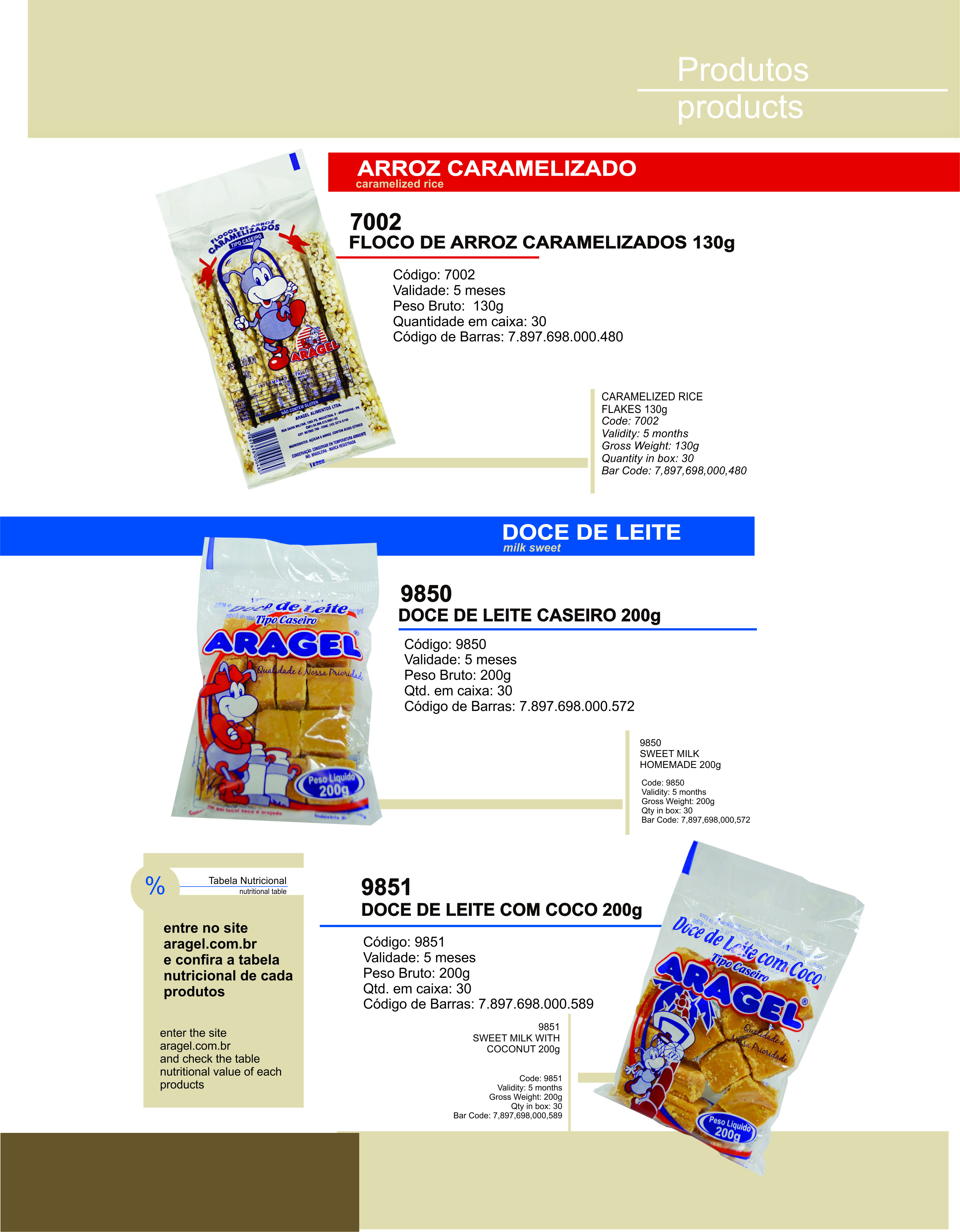 Principais produtos: Amendoin Crocante Amendoin leite Doce de Amendoin Doce de Abóbora Geléia Tipo Mocotó Flocos de Arroz Paçoca de Amendoin Suspiro Torrone Geléia de Marshmallow